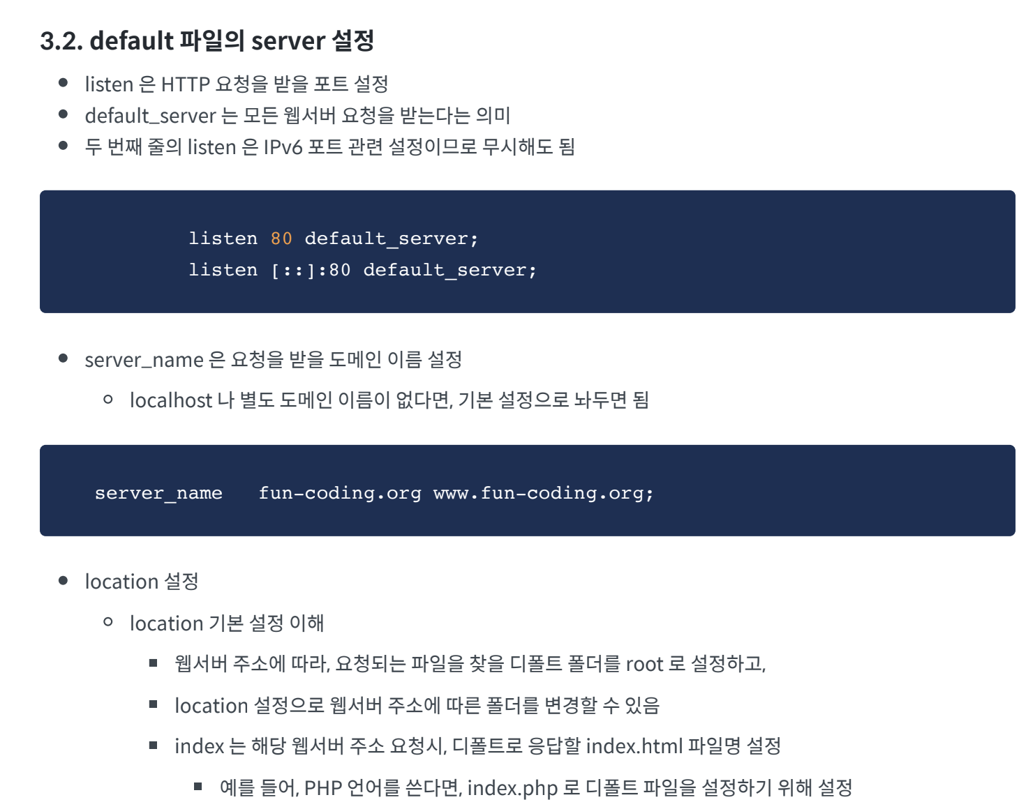 server_name _; // 도메인이름이 없다면 그대로, 있다면 도메인 이름을 넣는다.