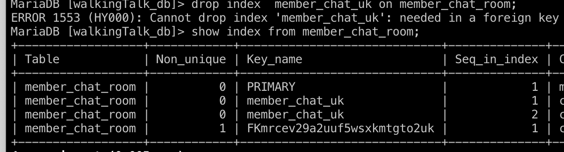 위와 같이 uk를 설정하니, 자동으로 해당 uk에 대해 mariaDB가 아래와 같이 인덱스를 구성한 것을 볼 수 있다.
