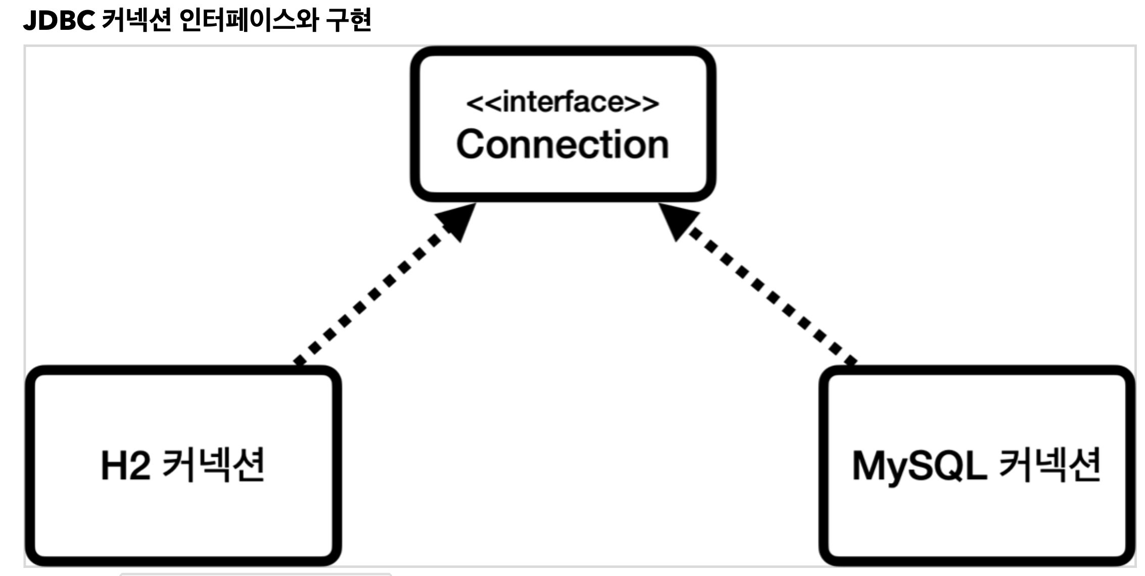 우리는 H2 데이터베이스 드라이버만 라이브러리에 등록했기 때문에 H2 드라이버가 제공하는 H2 커넥션을 제공받는다. 물론 이 H2 커넥션은 JDBC가 제공하는 java.sql.Connection 인터페이스를 구현하고 있다.