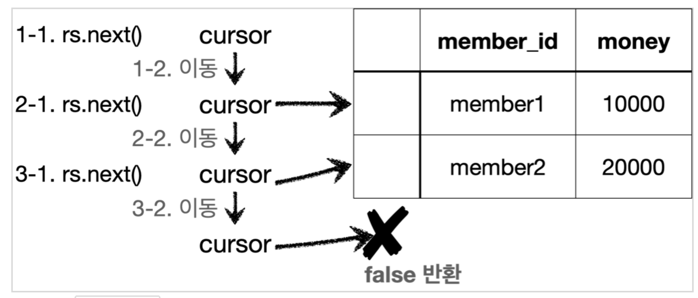 rs.next() 의 결과가 false 면 더이상 커서가 가리키는 데이터가 없다는 뜻이다. rs.getString("member_id") : 현재 커서가 가리키고 있는 위치의 member_id 데이터를 String