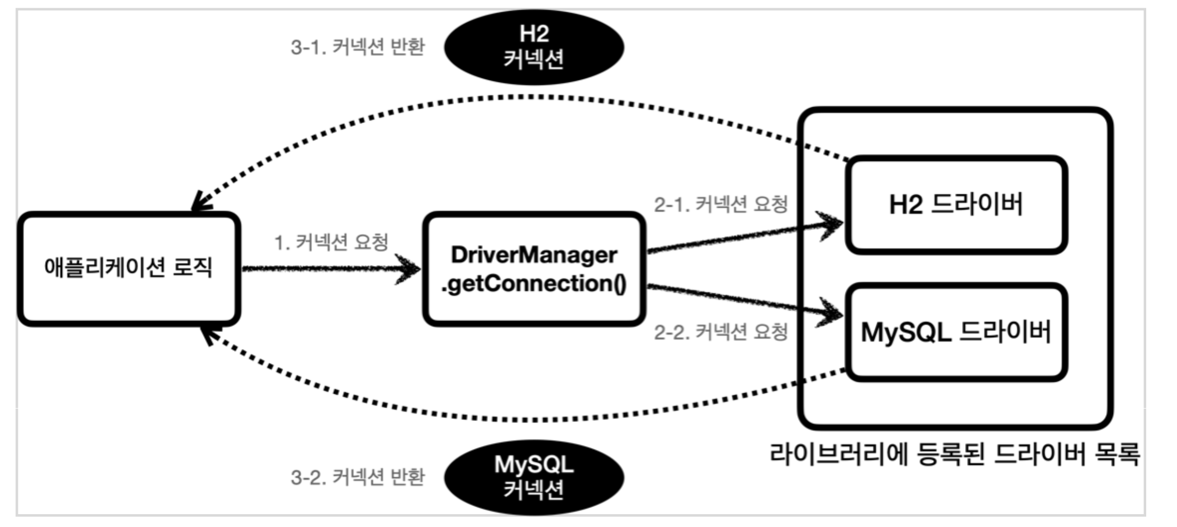 여기서 각각의 드라이버는 URL 정보를 체크해서 본인이 처리할 수 있는 요청인지 확인한다. 예를 들어서 URL이 jdbc:h2 로 시작하면 이것은 h2 데이터베이스에 접근하기 위한 규칙이다. 따라서 H2 드라이버는 본인이 처리할 수 있으므로 실제 데이터베이스에 연결해서 커넥션을 획득하고 이 커넥션을 클라이언트에 반환한다. 반면에 URL이 jdbc:h2 로 시작했는데 MySQL 드라이버가 먼저 실행되면 이 경우 본인이 처리할 수 없다는 결과를 반환하게 되고, 다음 드라이버에게 순서가 넘어간다.