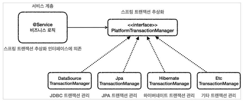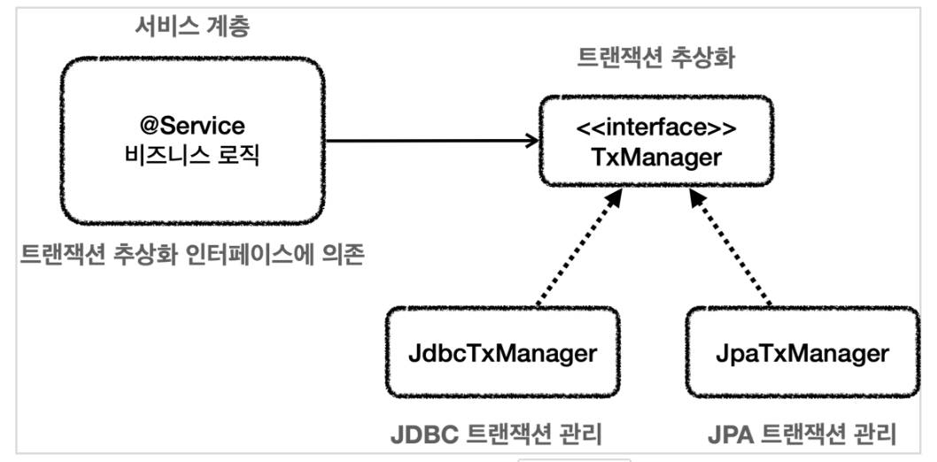 - 트랜잭션 추상화( DIP , 기술을 바꿔도 Service가 불변하도록)