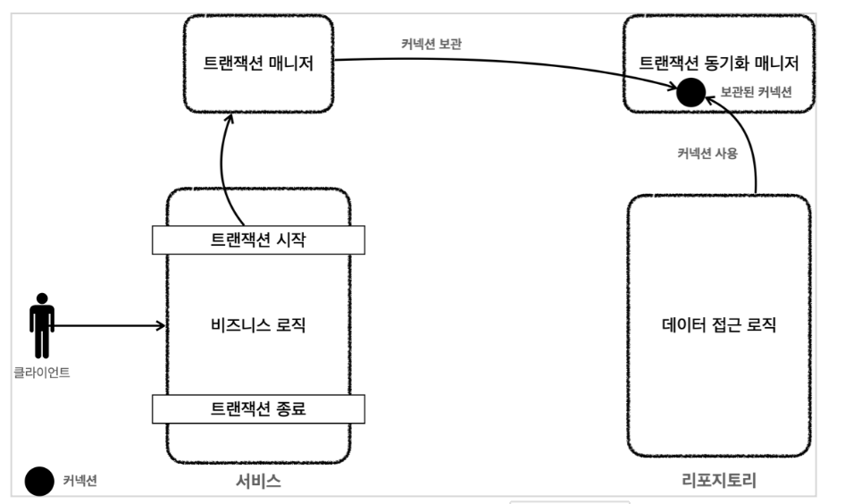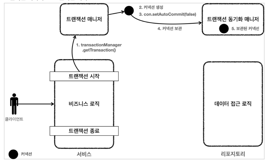 - 리포지토리는 DB접근시, 트랜잭션 동기화 매니저에서 보관된 커넥션을 가지고온다.