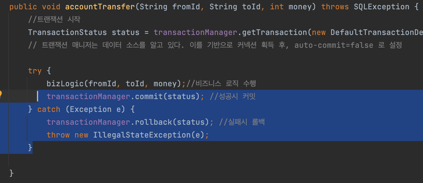 transactionManager.commit(status); //성공시 커밋 } catch (Exception e) {