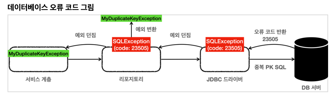 서비스 계층에서는 예외 복구를 위해 키 중복 오류를 확인할 수 있어야 한다. 그래야 새로운 ID를 만들어서 다시 저장을 시도할 수 있기 때문이다. 이러한 과정이 바로 예외를 확인해서 복구하는 과정이다. 리포지토리는 SQLException 을 서비스 계층에 던지고 서비스 계층은 이 예외의 오류 코드를 확인해서 키 중복 오류( 23505 )인 경우 새로운 ID를 만들어서 다시 저장하면 된다.