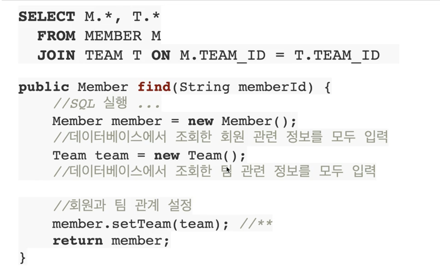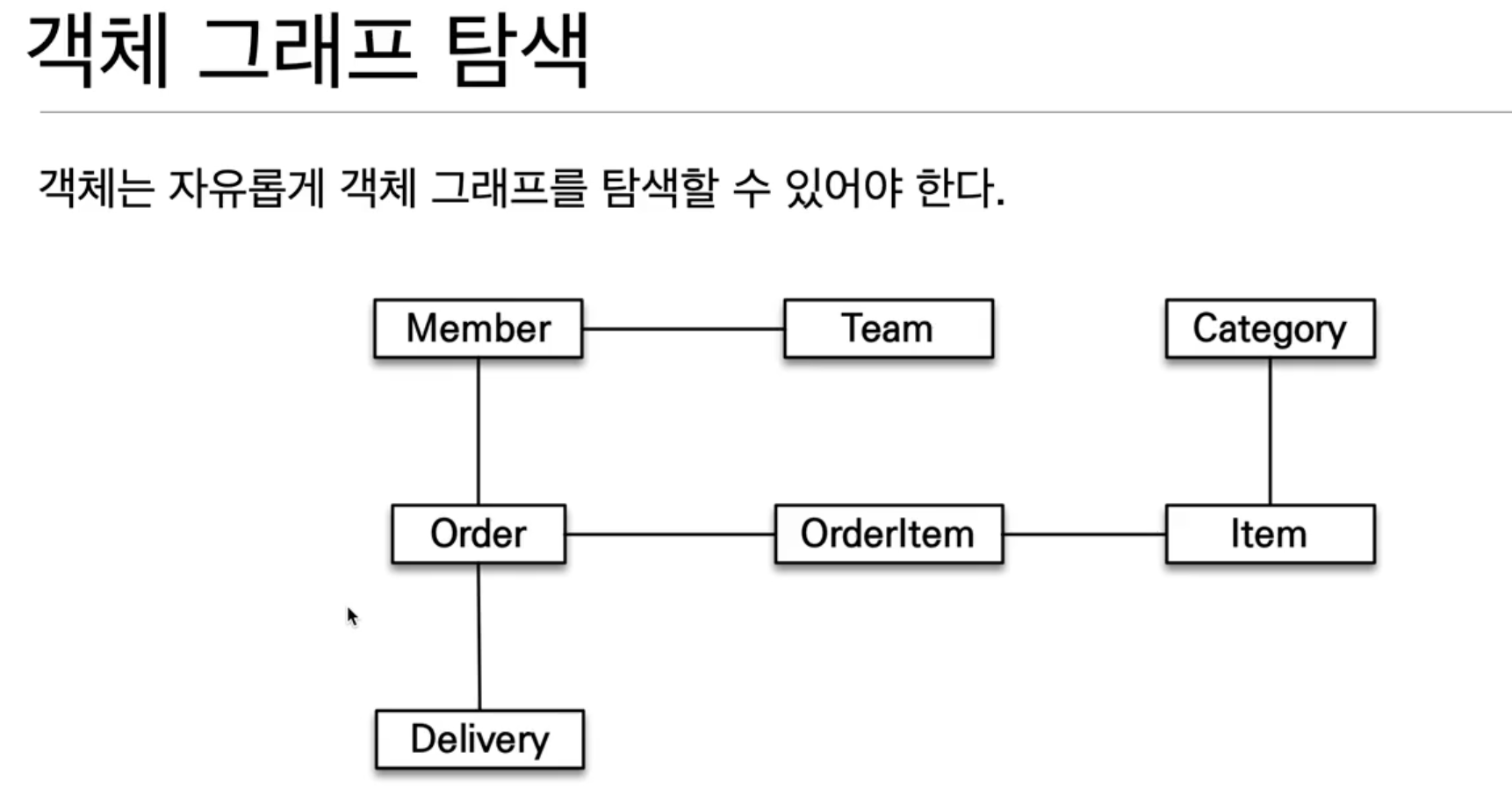 하지만 실제 테이블에선, join을 통해 수행되기에 SQl 수행 시 그때의 시점으로 , 객체 그래프가 제한된다.