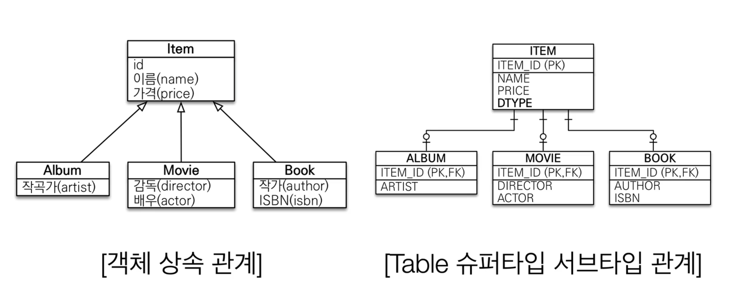 테이블엔 상속 관계가 없고, 유사한 슈퍼타입, 서브 타입으로 대체한다.